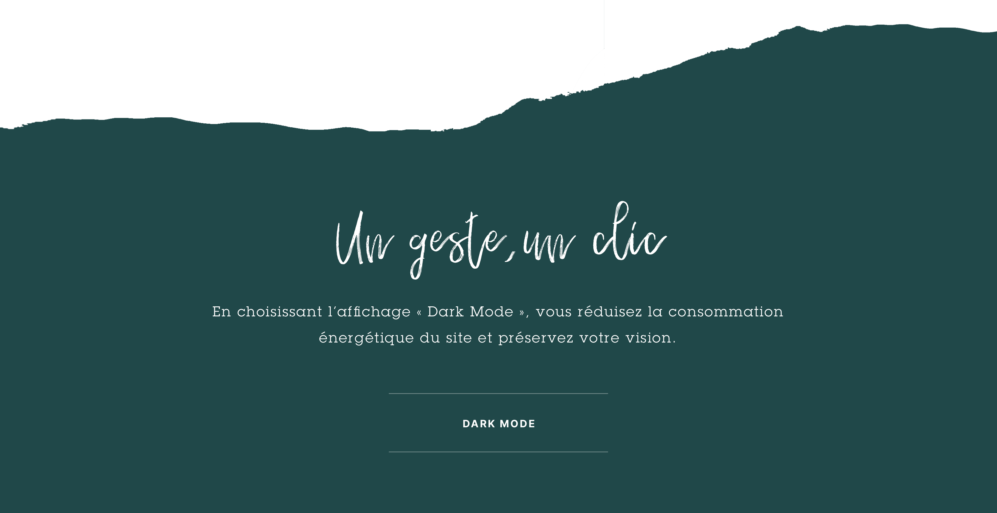 Un mode d’affichage « DARK MODE » : réduisant la luminosité et les contrastes, pour prendre soin de ses yeux et diminuer la consommation énergétique. Un site eco-responsable pour la planète mais aussi pour celui qui le regarde :une expérience porteuse de sens et d’émotions profondes pour impliquer l’utilisateur tout au long de son parcours.